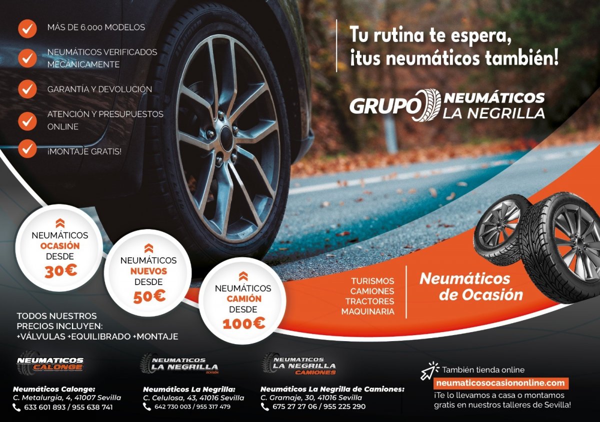 Neumáticos Sevilla La Negrilla es un taller de neumáticos especializado en cubiertas nuevas y de ocasión para coches, furgonetas y todo tipo de vehículos. También prestamos servicios de alineado de dirección y mecánica rápida. ¡Consúltanos sin compromiso o visítanos sin cita previa en C/ Celulosa, 43 (Polígono Industrial La Negrilla)!